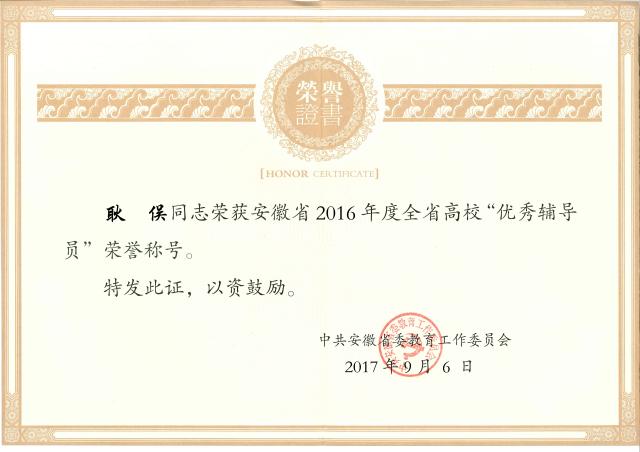 “責任”是輔導員工作的動力、行為前提。耿俁的心頭時時刻刻都裝著輔導員育人沉甸甸的責任。“己所不欲,勿施于人”、“正人先正己”、“身高為師,德高為范”是他時常提及的座右銘。他始終以榜樣的標準要求自己,凡事以身示范。他的行為受到了組織、同事和領導的認可,多次被評為合肥學院:優秀共產黨員、優秀輔導員、優秀共青團干部、就業先進個人、三育人先進個人及合肥市事業單位工作人員年度考核優秀等,也正是因工作業績突出,他曾于2014年被學校選拔到合肥市包河區掛任團區委副書記,并被區委組織部授予優秀掛職干部稱號。