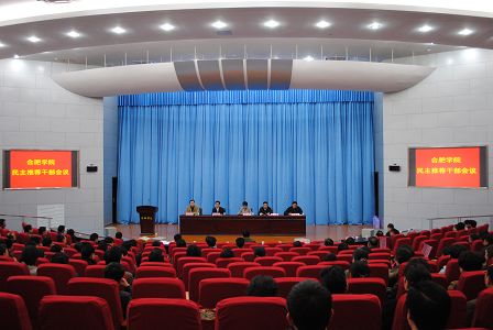 3月22日上午,合肥學院民主推薦干部會議在我院南艷湖校區新圖書館學術報告廳舉行。中共合肥市委常委、組織部部長凌云,省委組織部調研員、企事業干部處副處長張日升,合肥市委組織部副部長完顏邵建等省委、市委考察組成員親臨會議。我院院級領導班子成員,處級領導干部,副高以上專業技術人員,省市人大代表、政協委員,民主黨派市委會負責人、院教代會主席團成員,共二百多人參加會議。會上,我院黨委書記陶登松向大家介紹了省、市考察組成員,中共合肥市委常委、組織部部長凌云主持會議,省委組織部調研員、企事業干部處副處長張日升作了動員講話。