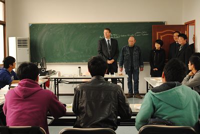 會議結束后,韓北山先生在蔡敬民院長的陪同下參觀了我院藝術設計系德國留學生設計的作品。在中德友誼樹前合影留戀后,韓北山先生又來到中德中心,與在那里學習德語的我院學生進行了交流互動。最后,韓北山先生參觀了我院的二期圖書館和體育館,并對我院的規劃建設贊不絕口