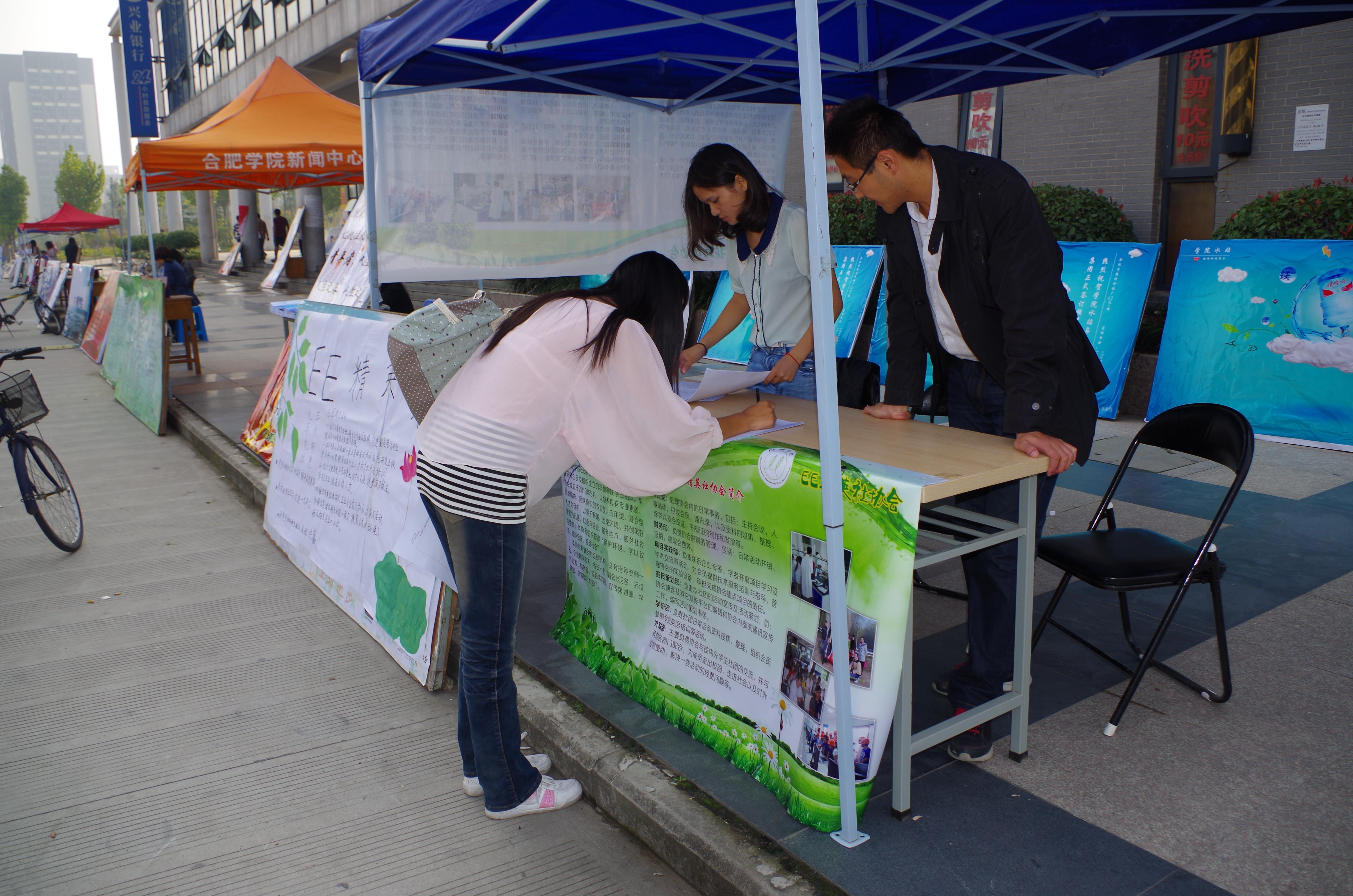 20131017日合肥學院研究生環境工程精英社(Environment Engineering精英社,簡稱EE精英社第一次招新圓滿結束。本次社團招新共招會員38名,社團成員以研究生為主體,其中2013級研究生23,本科生15人。