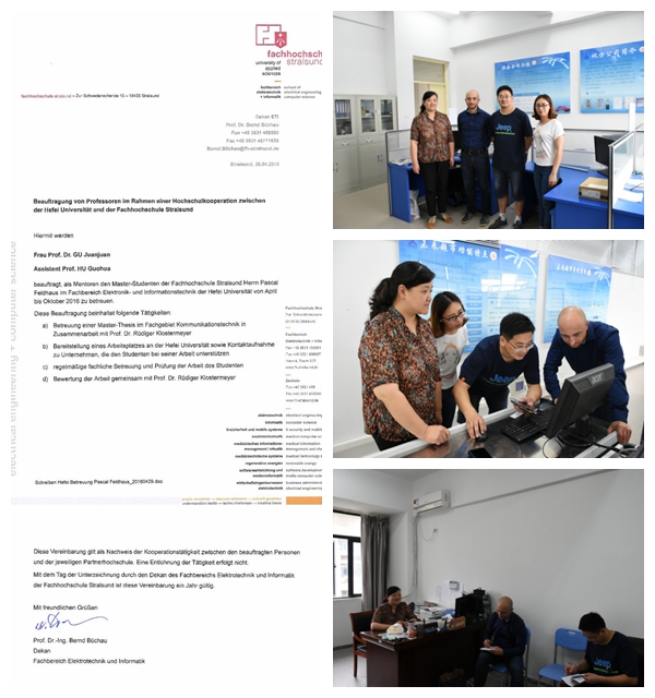 我校電子信息與電氣工程系顧涓涓教授和胡國華副教授受德國施特拉松應用科學大學委托,共同擔任該校在讀碩士研究生Feldhaus Pascal的畢業論文指導教師,指導時間為2016年4-10月。該生已于4月19日來到合肥學院,開始為期7個月學習和研究,主要完成室內導航和定位系統的設計與開發項目,并完成其碩士畢業設計(論文)。