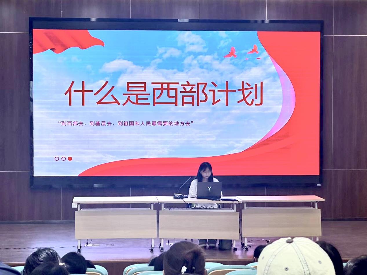 接下來,徐寧浩和秦思斯同學分享了她們的學習和擇業經驗,重點介紹了她們報考西部計劃的經歷和收獲,為同學們展示了另一種實現人生價值的途徑。她們為大家介紹了什么是西部計劃、為什么要選擇西部計劃,并對西部計劃的報考要求和時間節點進行了詳細講解。