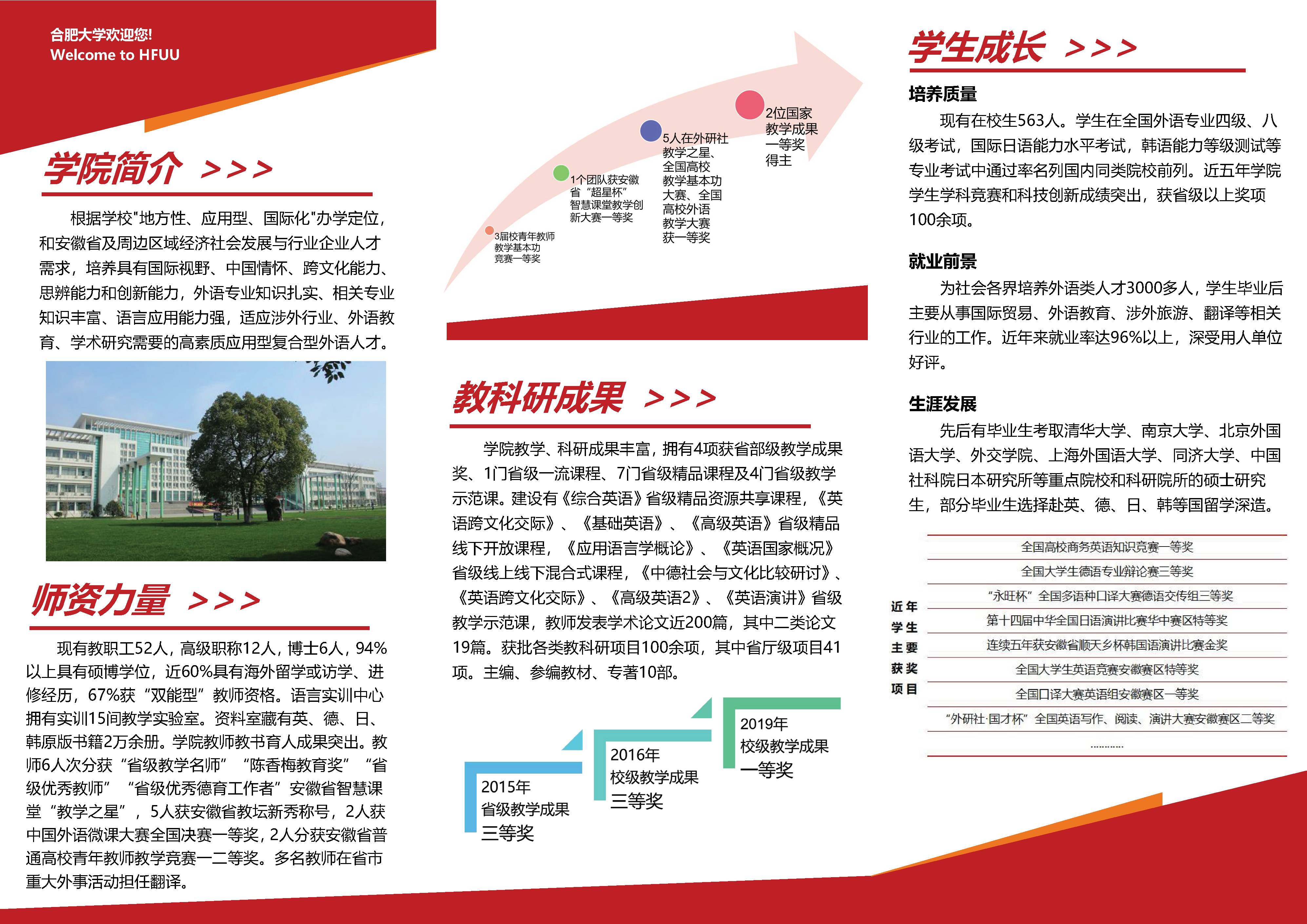 外國語學院現有英語、德語、日語三個本科專業,并承擔學校合作辦學專業的語言教學工作。其中英語專業、德語專業獲批省級一流本科專業建設點,德語專業是安徽省首個德語本科專業、省級綜合改革試點專業。現有教職工53人,高級職稱11人,博士及在讀博士7人,100%具有碩博學位,近60%具有海外留學或訪學、進修經歷,67%獲“雙能型”教師資格。語言實訓中心擁有15間實驗室。教師6人次分獲“省級教學名師”“陳香梅教育獎”“省級優秀教師”“省級優秀德育工作者”安徽省智慧課堂“教學之星”,安徽省教壇新秀5人,4人獲中國外語微課大賽全國決賽一等獎, 2人分獲安徽省普通高校青年教師教學競賽一二等獎。學生在全國外語專業考試中通過率名列國內同類院校前列。近五年學生獲省級以上獎項100多項。學生主要從事國際貿易、外語教育、涉外旅游、翻譯等相關行業的工作。先后有畢業生考取重點院校和科研院所的碩士研究生,部分畢業生留學深造。