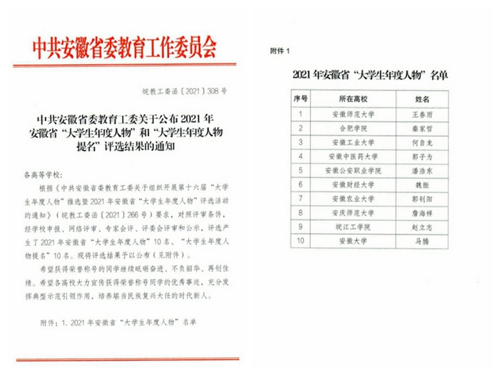 近日,中共安徽省委教育工委下發《關于公布2021年安徽省“大學生年度人物”和“大學生年度人物提名”評選結果的通知》,公布了安徽省“大學生年度人物”10名及提名獎10名,我校生物食品與環境學院2017級學生秦家哲入選2021年安徽省第十六屆“大學生年度人物”。