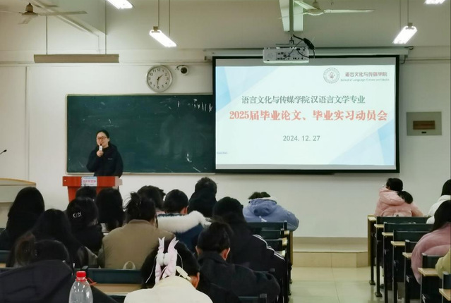 2024年12月27日,語言文化與傳媒學院2025屆漢語言文學專業畢業論文與畢業實習動員大會在5棟303教室召開。動員會由中文系主任洪婧主持,21級漢語言文學專業全體學生及部分指導教師參加。