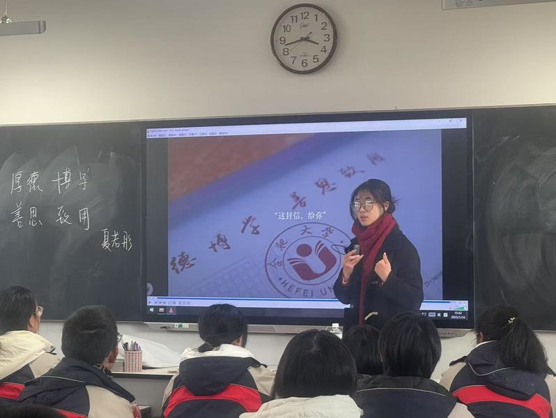 本次活動(dòng)涉及合肥一中、合肥六中、合肥168中學(xué)等省內(nèi)外28所中學(xué),影響了近千位高中學(xué)生。來自24級新聞1班的夏若彤返回母校阜陽紅星中學(xué),她以介紹合肥大學(xué)的特色與優(yōu)勢為核心,向同學(xué)們展示了大學(xué)生活的魅力,詳細(xì)講解了學(xué)校的專業(yè)設(shè)置和課程安排,特別是一些特色專業(yè)和同學(xué)們感興趣的熱門專業(yè)。同時(shí)還分享了豐富多彩的校園活動(dòng),包括社團(tuán)、體育賽事、學(xué)科競賽和志愿服務(wù)等內(nèi)容,展現(xiàn)了大學(xué)生活的多元化。在宣講過程中,夏若彤積極與高中生們積極互動(dòng),耐心回答他們提出的關(guān)于大學(xué)生活、學(xué)習(xí)規(guī)劃等方面的問題,并結(jié)合自身經(jīng)歷分享了經(jīng)驗(yàn)。