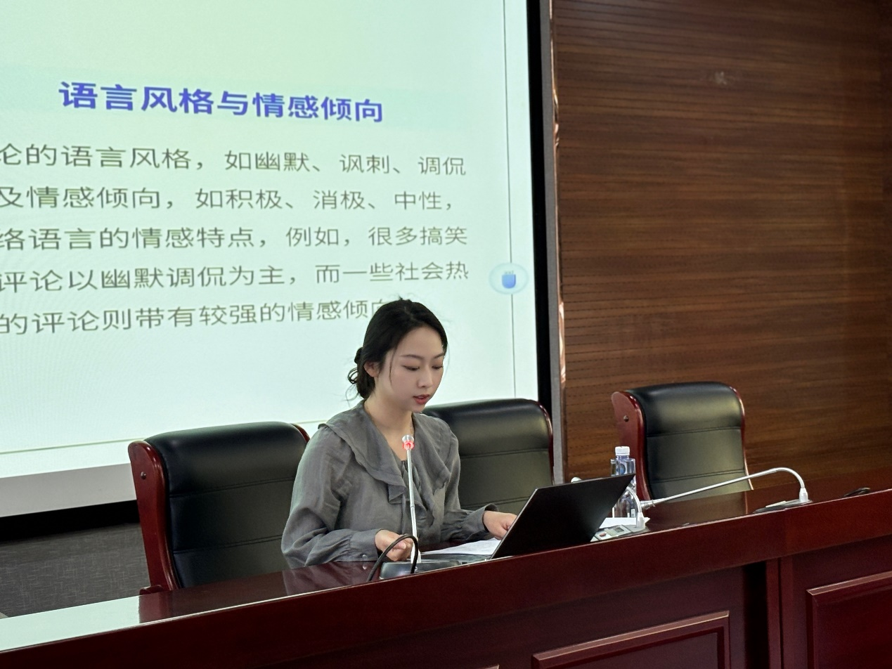 趙天琪以“語言網(wǎng)絡(luò)化”為切入點(diǎn),結(jié)合李普曼的“擬態(tài)環(huán)境”理論和馬克思的“交往論”,剖析了數(shù)字化交往對(duì)語言生態(tài)的重構(gòu)。她在講座中談到,網(wǎng)絡(luò)語言不僅是交流工具的革新,更是思維方式的變革。從傳統(tǒng)的邏輯性表達(dá)轉(zhuǎn)向碎片化、娛樂化的“語言通脹”,例如“哈哈哈哈”式的情感宣泄、網(wǎng)絡(luò)熱梗的泛濫使用,以及表情包對(duì)文字表達(dá)的替代。這種現(xiàn)象背后,折射出媒介技術(shù)對(duì)人類思維的深層規(guī)訓(xùn)。