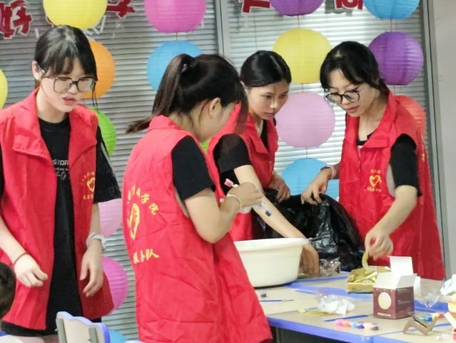 911日下午3:40,志愿者們抵達竹園社區開展中秋游園會活動。在負責人的引領下,志愿者們各司其職,確保現場秩序井然,并協助孩童制作中秋月餅、進行扎染和繪制月球燈,為他們編織了歡樂與溫情交織的記憶。活動結束后,志愿者們主動清理現場,保護社區的優美環境。