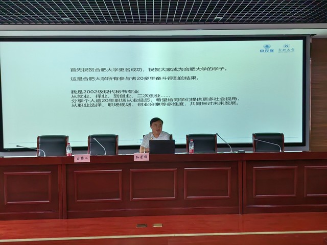 618日下午1430,特邀嘉賓我校著名校友—2002級原中文系秘書專業,現任中農聯控股安徽有限公司總經理孫榮錦先生于一區博學樓C座學術報告廳為我們帶來《筑夢合大,志在四海》的講座報告,旨在分享其逾20年職場從業經歷,給同學們提供更多社會視角,從職業選擇、職場規劃、創業分享等多維度,共同探討大學生的未來發展。本次講座由語言文化與傳媒學院副院長殷明明主持,全院師生踴躍參與。