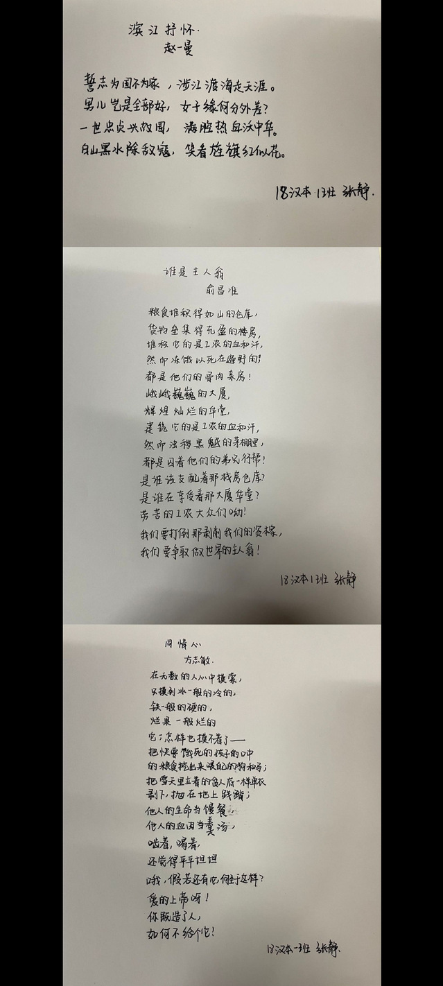 除此之外,黨員同志們還積極誦讀革命烈士詩抄,以手抄的形式表達對革命烈士的崇敬。他們紛紛表示在抄寫之時仿佛看見了無數(shù)革命烈士的錚錚傲骨,大義凜然,如是董存瑞高舉的炸藥包,如是黃繼光挺起的胸膛。通過詩歌仿佛目睹了劉胡蘭“怕死不當共產(chǎn)黨員”的豪邁,吉鴻昌“恨不抗日死,留作今日羞。國破尚如此,我何惜此頭”的慷慨,夏明翰“砍頭不要緊,只要主義真,殺了夏明翰,還有后來人”的激昂,更有千千萬萬個無名戰(zhàn)士“寧為戰(zhàn)死鬼,不做亡國奴”的凜然正氣。