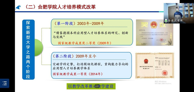 課程伊始,余國江教授首先帶領同學們回顧了合肥學院成立及發展的歷程,并向同學們詳細介紹了合肥聯合大學即合肥學院前身的創辦者楊承宗先生的科研及創校經歷。緊接著,余教授向同學們介紹了合肥學院人才培養模式改革。他指出,自合肥學院辦校以來,就取得了許多輝煌成就。合肥學院人才培養模式改革的不斷推進,得到了許多領導人的支持與贊揚,并取得了一定的成效。最后,余教授為同學們播放了一段有關楊承宗先生的介紹視頻,更加彰顯了楊承宗先生的偉大形象與對中國“兩彈一星”研制的巨大貢獻。余教授與張愛萍書記均指出,同學們應當向楊承宗先生學習,端正態度,積極進取,堅定不移地跟隨中國共產黨的腳步,堅持黨的正確領導。