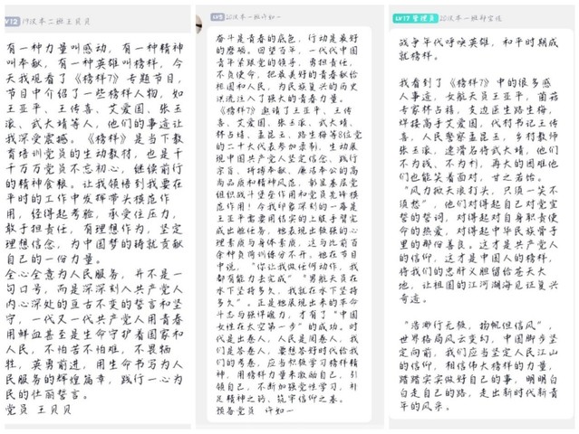 觀看完《榜樣》節(jié)目后,學(xué)生黨員們都獲益匪淺,王貝貝同學(xué)說:“全心全意為人民服務(wù),并不是一句口號,而是深深刻入共產(chǎn)黨人內(nèi)心深處的亙古不變的誓言和堅守,一代又一代共產(chǎn)黨人用青春用鮮血甚至是生命守護著國家和人民,不怕苦不怕難,不畏犧牲,英勇前進,用生命書寫為人民服務(wù)的輝煌篇章,踐行一心為民的壯麗誓言。”許如一同學(xué)感慨道:“奮斗是青春的底色,行動是最好的磨礪。回望百年,一代代中國青年緊跟黨的領(lǐng)導(dǎo),勇?lián)熑危回撌姑炎蠲篮玫那啻韩I給祖國和人民,為民族復(fù)興的歷史洪流注入了強大的青春力量。時代是出卷人,人民是閱卷人,我們是答卷人,要想答好時代給我們的考卷,應(yīng)當積極學(xué)習(xí)榜樣精神,用榜樣力量來激勵自己,引領(lǐng)自己,不斷加強黨性學(xué)習(xí),補足精神之鈣、筑牢信仰之基。”鄭寶佳同學(xué)也說: “‘浩渺行無極,揚帆但信風,世界格局風云變幻,中國腳步堅定向前,我們應(yīng)當堅定人民江山的信仰,相信偉大榜樣的力量,踏踏實實做好自己的事,明明白白走自己的路,走出新時代新青年的風采。